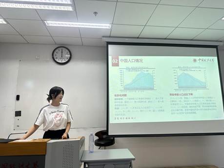 2023级政治经济学专业的蔡雨颖同学以《告别 “人口红利依赖”:人口负增长时代如何应对挑战》为题进行了汇报。她认为中国人口负增长这一趋势由长期低生育率驱动,经济压力、高养育成本、性别平等困境及社会保障不足等因素加速了生育意愿下降。她指出人口负增长从供给侧导致劳动力短缺、资本回报率下降,从需求侧抑制消费,加剧经济增长挑战。然而,机遇仍存,包括通过提升人力资本、推进户籍制度改革、改善收入分配及建设福利国家等措施,有望缓解老龄化压力并释放新的发展潜力。
