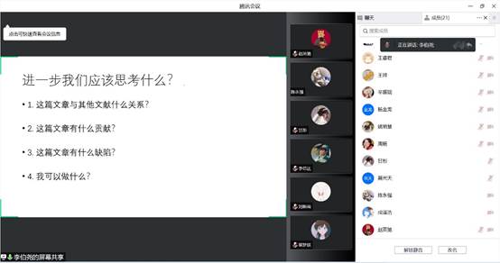此外,李伯尧老师也以本研究为例,向同学们提出了文献研读时需要重点思考的问题:本篇文章与其他文献有什么关系?本篇文章有什么贡献或缺陷?如何在现有研究基础上进一步探究?李伯尧老师对上述问题一一进行了耐心地解释,并强调今后学术研究中要多读经典文献、最新文献;要注重文献研读与自身思考相结合。