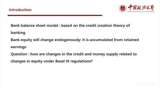 首先由王帅同学介绍了该篇文献的文章摘要与理论背景,深刻解释了巴塞尔协议Ⅲ的四项监管比率要求(资本充足率、杠杆比率、流动性覆盖率和净稳定资金比率)及其对商业银行信用创造的影响。在此基础上,王帅同学进一步介绍了本文的研究目的,即在巴塞尔协议Ⅲ监管框架下,探究银行由于利息收支导致的权益变动如何影响信贷创造规模的变动。为同学们明确了本研究的重要贡献与政策建议。