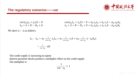 接下来廖韬同学介绍了本文的模型建立与乘数推导。首先向大家讲解了本文用于研究商行信贷规模变动的重要工具——动态的资产负债表,利用不同时期表内的贷款规模与银行权益的变动关系探究两者的乘数效应。随后该同学结合巴塞尔协议Ⅲ中两项资本性监管指标(资本充足率和杠杆率)约束下,银行如何调整自身贷款投放量,以达到利润最大化的目的,以此得出银行的贷款规模变动与权益变动的乘数效应。在确定银行最大化利润时,廖韬同学还为各位同学介绍了本文使用的重要数学方法——拉格朗日乘数法,用以求得银行在监管约束条件下的利润最大化情况。基于以上模型建立与数学推导,本部分得出了资本充足率和杠杆率监管要求下的银行信贷创造乘数。