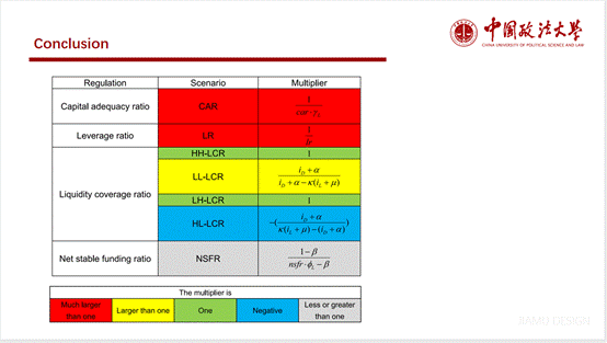最后由夏天宇同学带来流动性指标对于银行信贷供给乘数的影响及本文的最终结论。在监管要求的流动性覆盖比率的情况下,共有四种情况(前后现金流入大于流出、前后现金流入都小于流出、前流入小于流出后流入大于流出和前流入大于流出后流入小于流出),在运用不同时刻的资产负债表的恒等公式、利息冲击带来的影响的情况与巴塞尔协议Ⅲ要求的流动性覆盖比率的公式后推导出了不同情况的信贷供给乘数,分析出不同情况下会有不一致的信贷供给乘数,给商业银行面对巴塞尔协议的监管的措施提供了一定的帮助。接下来的净稳定资金比率所影响的信贷供给乘数同样具有不同的结果,对于商业银行的经营影响也需要特定情况特定分析。