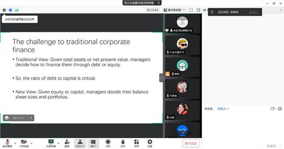 三位同学发言结束后,李伯尧老师做了点评和指导,对三位同学讲解的模型建立与数学方法的使用表示了肯定,并再次为各位同学明确了本研究的核心思想与结论。在进一步介绍本文研究成果的同时,李伯尧老师提出如何利用传统视角解决实体经济中的问题,为同学们今后的研究提供了重要思路。