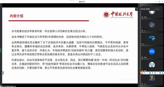 党的二十大指出从现在起,中国共产党的中心任务就是团结带领全国各族人民全面建成社会主义现代化强国、实现第二个百年奋斗目标,以中国式现代化全面推进中华民族伟大复兴。在此之中教育、科技、人才是全面建设社会主义现代化国家的基础性、战略性支撑,创新驱动发展战略、科教兴国战略、人才强国战略是我国必须深入实施和坚持的战略。本次读书会所阅读的《创造性破坏的力量》这本书对创新与经济增长、技术革命与就业、绿色创新与可持续增长、全球化与逆球化、谁是创新者、教育与创新的关系等一系列重大经济问题进行了讨论。本书在回顾总结与创新相关实证研究的基础上,系统阐述了与创新有关的经济、社会和政治问题,强调了熊彼得所提出的“创造性破坏”这一范式在分析与解决这些问题时所能提供的视角。