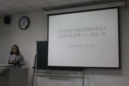 陈希沧同学基于马克斯·韦伯的《社会科学方法论》,首先就全书的体例进行了简要介绍,在此基础上深入分析了韦伯对理想与价值判断之科学批判的意义以及经验知识与价值判断的原则区分。他强调了马克斯·韦伯是提出“价值中立”与“价值无涉”观念的第一人,并就这一概念进行详尽的说明。胡李蒙同学在提炼了《经济史上的结构与变革》一书分析框架的基础上,通过对产权理论、国家理论以及意识形态理论的阐释向大家介绍了诺思的制度变迁理论,并在最后简要的探讨了制度理论对当前中国实践的借鉴意义。黄婷婷同学分享了《江村经济》一书的研究方法,并就本书中涉及的家庭人口控制与土地的关系联结进行了深入探讨。仇博同学重点阐述了《改造传统农业》中关于如何把弱小的传统农业改造成为一个高生产率的经济部门的解决方法,并通过比对中美传统农业特点重点分析了改造传统农业在当代中国的具体实践。根据《集体行动的逻辑》一书的脉络,刘欣源同学探讨了集体行动的实现路径及失败原因,并提出自己的几点思考,引发与会师生的热烈讨论。耿晖同学通过对《人性中的善良天使》一书行文架构的把握,对人类历史长河中暴力呈下降趋势的原因进行了解读,并详尽地分享了本书对六大趋势、五个心魔、四位善良天使以及五种历史力量的阐释。