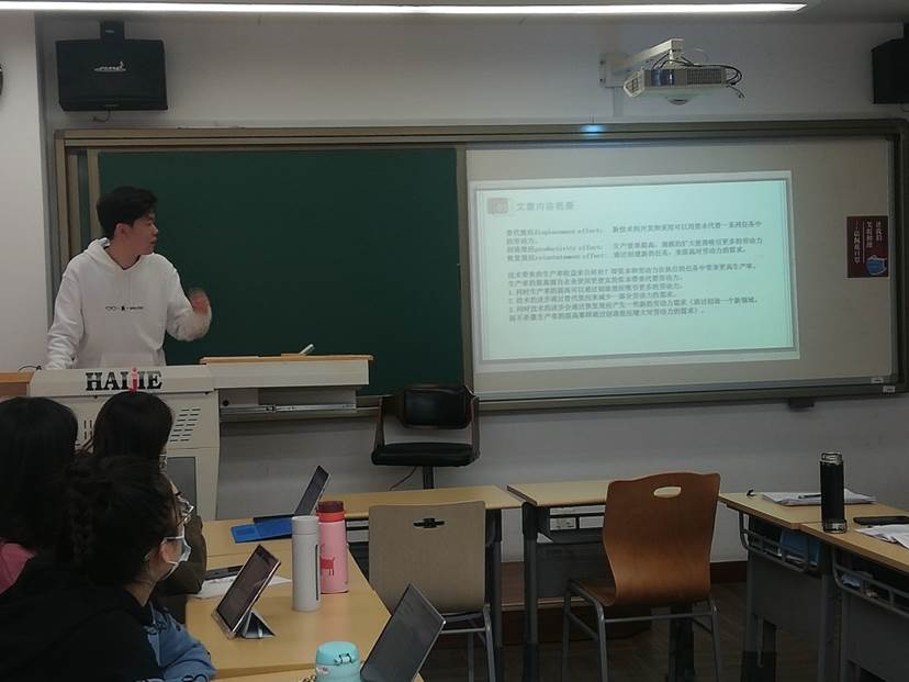 四位同学做完主报告后,同学们结合文章的内容和现实之间的联系展开自由讨论。贾丽璇同学指出有关自动化对劳动力需求的影响的争论由来已久,而之前的自动化的出现没有造成大规模失业的原因是当时的机器还必须与人相结合,而在当下技术进步的影响则未可知。她还认为,自动化的出现对于产业结构有着很大的影响。石思雅同学联系了其他学者的文献,指出技术进步所产生的对于劳动力需求的影响在未来是积极的。赵宇萱同学指出在技术进步的过程中,市场对劳动者的技能要求在不断降低,而这会造成就业两极化,从而会扩大人们的收入差距,加剧不平等。欧文潇同学提出,技术进步会导致低素质劳动力被淘汰,并且提出了 “政府如何平衡自动化和新任务之间的关系”的问题。徐子琪同学指出,论文中所提到的自动化与人工智能是有较大区别的,因此二者对劳动力的需求影响也是不同的,需要分别用不同的指标来进行度量和分析。周阳同学对自动化的有利之处进行了分析,指出当自动化不断发展时,我们要怎样做好劳动力培训才能让他们尽快适应快速变革的技术。杜函辉同学认为技术进步对劳动力需求的影响需要分阶段来分析,资本化程度较低时,技术进步对于劳动力需求的影响是正向的;而在资本化程度较高时,技术进步对于劳动力需求的影响是负向的。在热烈的讨论中,同学们都积极思考,踊跃发言,展现了不同视角的思想碰撞。
