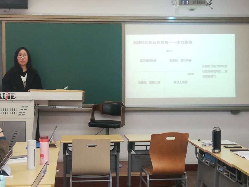 马慧博同学首先对论文的整体框架以及论文的结论进行了详细的介绍。同时她联系理论和现实,将自动化对职业的影响进行了划分,提出了“所需社交能力和决策能力越弱的职业越容易被替代”的观点。