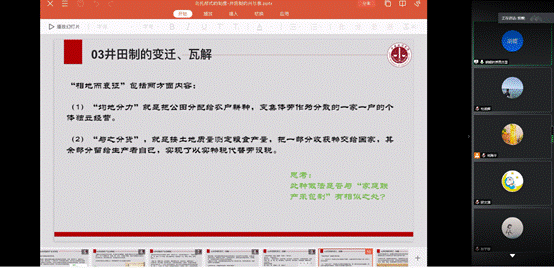 胡蝶同学首先介绍了本书的作者,然后重点分析了书中所提到的井田制,阐述了井田制的产生过程、井田制的特征与其崩溃瓦解的全经过。并将井田制与我国80年代的家庭联产承包责任制相对比,认为生产关系要适应生产力的发展。