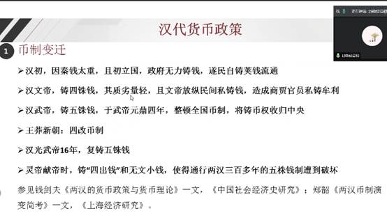 杜函辉同学介绍了唐宋元明清的经济概况,对比了唐代和汉代的经济制度优劣以及唐宋元明清的赋税制度,分析了租庸调制的优点以及瓦解的原因。还介绍了历朝历代的货币制度以及漕运改革,分析了朝代兴盛衰亡背后的逻辑,并且提出了“制度改革要与时俱进,需求要同步跟上制度和技术创新”的思考。