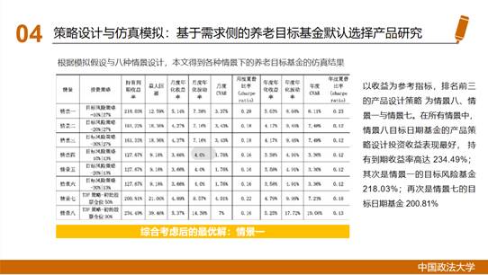在养老目标基金资产配置策略方面,宁晨君同学分别对美国QDIA条款、英国NEST计划和中国香港的DIS策略与强积金计划进行介绍。她指出境外经验和国际惯例都形成了“自动加入+默认产品+税收优惠”的政策合力。在此基础上,她进一步结合我国投资者的实际需求设计产品方案,通过两种不同初始权益比例的目标日期基金和两种不同风险敞口的目标风险基金,预置模拟条件和投资策略情景,进行了资本市场实际模拟,提出了以收益率、最大回撤和夏普比率等为评判指标研究养老目标基金默认选择产品的最优备选方案。