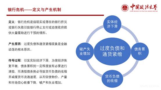 接下来李聪慧同学给大家介绍了第二篇文献《银行股权与银行危机》。她先介绍了金融危机的四个分类,包括银行危机、股市危机、货币危机和债务危机。然后详细介绍了银行危机的定义与产生机制,并解释其传导过程。最后得出两个结论:1、银行股权与未来银行信贷之间的关系是非对称的,只有巨大的负冲击才能预测信贷收缩;2、银行股权价格在银行业危机开始时往往比非金融股权下跌得更早,特别是在战后时期和发达经济体。