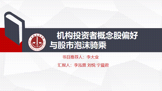 首先由刘悦同学介绍了中国当前A股市场上存在着部分机构投资者具有博彩偏好且重仓持有概念股的投资异像,并阐述了该文提出的关于机构投资者泡沫骑乘行为的三点假说。在此基础上,刘悦同学说明了论文中的数据采集过程、变量构造过程和模型构建过程,依此列举了待验证假说的具体内容,为后两位同学的汇报做好了铺垫工作。