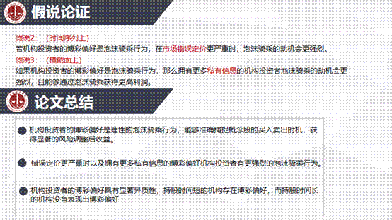 接下来,李泓霖同学针论文提出的第二点和第三点两点假说的验证过程及其结果进一步进行了详实的汇报并做出总结。从错误定价的角度看,当因剧烈波动、意见分歧等原因导致市场错误定价严重时,博彩偏好强烈的机构投资者会比正常市场情况下更倾向于进行概念炒作,为已有的市场动荡“火上浇油”;从私有信息的角度看,拥有更多私有信息即处于信息优势地位、且擅长选股的机构投资者也更可能制造、炒作概念股并从中获利。