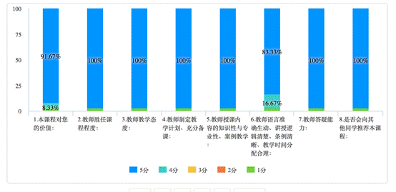 好评如潮,收获满满。课程结束,通过对学生进行问卷调查显示,校外老师的授课获得了同学们的一致好评,在多方面的问卷调查中,校外导师在胜任课程程度、教学态度、制定教学计划、充分备课、授课内容知识性与专业性、答疑能力、是否会推荐课程等6个方面获得了100%的5分(满分)好评,在课程价值及言语生动、逻辑清楚方面分别获得了91.67%和83.22%的5分好评。学生纷纷表示受益非浅,不仅通过这门课接触到了在校园学不到、不了解的知识(比如机构对资金的运作流程、行业内的结构体系、具体的应用案例),更是拓展了专业和实践的深度和广度,为未来的职业发展增加了更多的可能性。