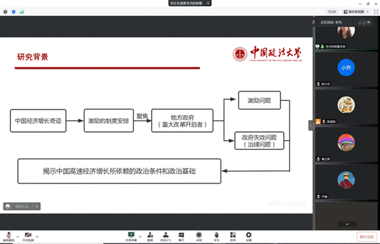 李丹同学首先结合书目讲述了中国经济增长和其所依赖的政治条件,从行政发包制、地方分权、财政分成、政治锦标赛以及“官场+市场”共五个角度切入,介绍了全书的主要内容,并就中国经济增长之谜提出自己的思考,她认为中国能取得如此瞩目的经济增长效果和现有的政治制度安排是分不开的。司海平老师就“我国航空航天技术、高铁、国防工业等领域保持先进但在医疗卫生、环境治理等方面还有待提高”这一问题提出了自己的见解,她认为从中央到地方的专项治理活动,例如创建卫生城市等,可以部分破解环境治理等方面的“瓶颈”,张弛老师就汇报中提到的“包干制”进行了进一步讨论,认为其背后存在着深刻的语境含义。