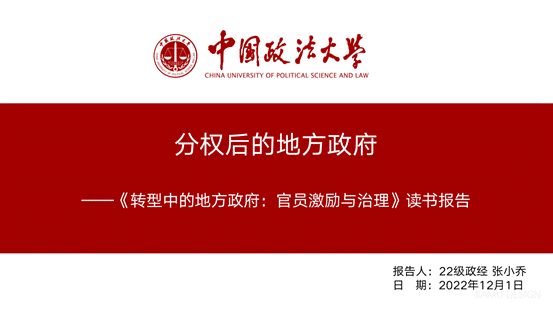 张小乔同学首先介绍了作者周黎安教授和他的相关研究领域及学术成果。接着她延续李丹同学的思考,和大家一同探讨了“改革开放以来,我国在如此长的一段时间内如何保持如此高的增长速度”这一问题,并向大家梳理了书中针对转型过程中地方政府角色和权力的变化以及如何激励、治理地方官员的逻辑。随后从行政发包制视角详细梳理了我国经济管理体制经历过数次“放权-收权”的循环,并对中国政府的“条块”结构进行分析。张弛老师建议大家可以尝试从信息经济学的角度理解政府治理问题。