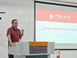系主任致辞环节,程碧波副教授首先对2024级研究生新生表示热烈欢迎,然后对资本金融系的专业方向及突出优势进行了全面而详细的阐述。同时,程碧波副教授还特别强调了,不论学硕还是专硕同学都要注重金融理论、推导过程的学习,扎实的金融理论知识能够让同学们未来在职场上游刃有余,是同学们受益终生的财富。