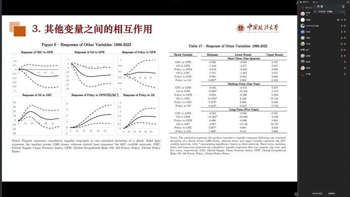接着,高梦晗同学为大家介绍了文章变量指标的选取、构建模型和实证结果内容。文章采用SVAR模型,衡量了各个可能影响因素对于总体、核心、食物和能源四种通货膨胀指标的影响程度,并且运用独立的正态-Wishart先验贝叶斯的方法对模型进行检验。随后,高梦晗同学详细分析了实证结果,详细解读了地缘政治风险、全球供应链压力和国际油价对全球通货膨胀率的影响。在综合分析一副累计脉冲响应图、三张标准差冲击实证分析表、一张方差分解表后,文章作者得出的结论是全球供应链压力是整个样本期间(1999-2022)全球整体通胀波动的主要驱动因素。高梦晗同学在分享自己读文章的收获时,也提出了几点关于文章没有详细说明部分的疑惑,并希望老师进行解答。