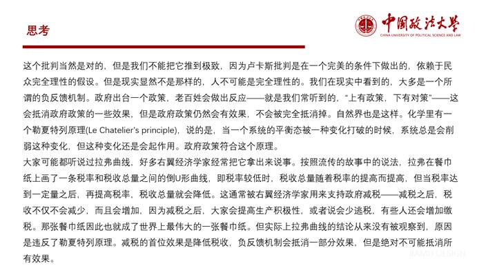 第三部分,徐可依同学先介绍了卢卡斯批判的政策考虑,探讨如何在理论考虑和实际操作之间找到一个平衡点,以便进行准确有效的政策评估。然后提出具体理解政策效果与市场预期之间的关系,以及如何通过管理预期来提高政策的有效性。并且提出对于论文结论的理解,即任何基于经验数据的经济模型不可以用于政策制定,因为政策的实施会改变得出该政策的模型本身。最后,提出了对于整篇论文的思考,强调了政府政策在现实中的效果是有限的,并且会受到民众反应的影响。同时,它也批评了卢卡斯批判在实际应用中的局限性,并指出政策效果的观察需要考虑负反馈机制的影响。并且提出思考,卢卡斯批判为政策制定者提供了重要的启示,即在制定和实施政策时,必须考虑到经济主体的预期反应,以及这些反应如何影响经济模型的参数和政策的有效性。这要求政策制定者采用更为复杂和动态的模型来评估政策,同时提高政策的透明度和沟通,以更好地管理预期。