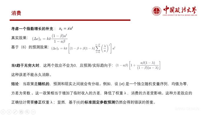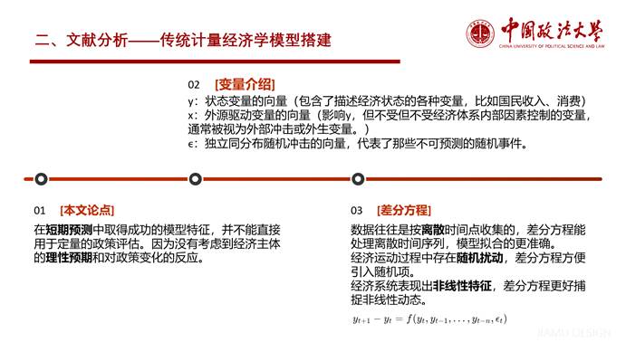 第二部分,王冰同学介绍了论文中的例子部分,主要是消费、税收和投资、菲利普斯的计量模型。根据弗里德曼的方式得出消费函数,考虑添加政策因素后对模型预测和实际的影响。得出当政策是随机的,预测和现实之间就会有分歧。基于标准固定参数预测仍然会得到错误的答案。第二个对比暂时性的税收政策和永久性的政策之间的影响程度,得出突然征收投资税率,在政策变化前的估计和政策变化后的估计在数量将有很大的出入,税收的真实效应也会比计量方法得出的结论大很多。因而政策变化所带来的影响用经济数量方法估计是很难准确的。最后根据市场中价格的不规则变动得出经济学家可能能够通过模型来预测通货膨胀和实际产出之间的关系,但这些预测可能并不可靠,因为它们可能没有考虑到现实世界中的复杂性。特别是在通货膨胀政策的实施可能带来意想不到的后果时,模型的预测可能与实际情况有很大的出入。
