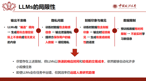 在对生成式AI有了基本的认识之后,王宇鑫同学继续深入讲解了LLMs的训练流程、扩展原则、提示工程以及局限性。她详细讲述了训练模型的三个阶段:预训练、指令微调以及通过人类反馈进行的强化学习,目的是使模型能够生成更符合人类偏好的高质量输出。而随着计算资源、模型参数数量以及训练数据量的增加,LLMs的拟合度和性能都会得到显著提升。在讨论提示工程时,作者指出,LLMs的输出质量很大程度上取决于输入的质量,因此他强调了耐心的重要性,并建议在提问时提供充分的上下文和风格指导。最后,王宇鑫同学介绍了LLMs由于其固有特性而面临的一些问题,包括信息编造、隐私泄露、刻板印象和偏见,以及数据限制等问题,并提醒大家在使用这些模型时要保持谨慎。