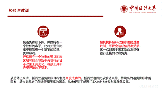 在对通货膨胀目标制的设计和实施方面,曾恩童同学联系通货膨胀目标制普遍的框架设计,以新西兰为例从衡量尺度、时间区间、责任承担等角度介绍通货膨胀目标制的具体设计。通过对新西兰20世纪90年代宏观经济发展进行总结检验新西兰货币政策的效果,她得出新西兰通货膨胀目标制总体上是高度成功的结论。在此基础上,她总结出严格固守一个狭窄的通货膨胀区域可能会导致中央银行的货币政策工具变化、导致工具和宏观经济的不稳定,以及,相机抉择解释政策态度的过度限制,可能会造成信用度受损的经验。