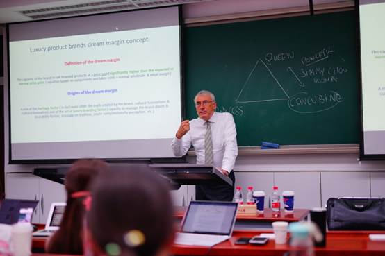 接着,他对奢侈品牌管理的核心概念进行了讲解。奢侈品牌管理不同于一般的品牌管理,品牌不仅仅是企业的名称,也不等于企业生产的产品,Morisset教授以新加坡KWANPEN公司为例展示了手提包行业里打造品牌的重要性,阐明了品牌应该是视觉概念与附加价值的共同表达,使受众获得某种感知,并形成文化与生活方式的一种互动。Morisset教授指出,坚持独特性是奢侈品牌的绝对准则,并提出了一套挖掘和维护品牌DNA的理论工具。奢侈品牌的DNA对品牌价值起着强化作用,常常与其创始人、创始年代、创始地点、技术工艺、文化传承等有关,又彰显于其产品的外形、品质、理念、气质、服务等方面。成功的品牌还应该擅于讲述自己的品牌故事,这也是突显品牌独特性的一种方式,聚焦品牌的历史、传奇与演化,再现品牌的创始人、设计师、工艺人、客户群乃至植根该品牌的文化与生活方式,选择恰当的表现形式,给人以向往与美的享受。