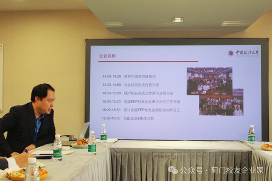 EEP项目招生大使、法大企业家俱乐部常务副理事长、蓟门瀚海创投管理合伙人柏铖,北京瀛和律师事务所高级合伙人刘永斌,法大拓荒牛跑团团长王振玲,法大医疗健康俱乐部创始人郑翔,北京睿格立特科技有限公司总经理赵楠,春天在哪礼总经理钱九,崇恩教育联合创始人郭凯乐,百洋医药集团战略客户经理李铁争,中能京投科技有限公司副总经理黄银燕,奥因旺生物科技(北京)有限公司总经理吴江等近20位EEP校友代表参加了本次筹备会议,会议由EEP校友柏铖主持。