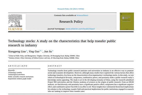 1.Xiangpeng Lian, Ying Guo*, Jun Su. Technology Stocks: A Study on the Characteristics that Help Transfer Public Research to Industry. Research Policy, 2021, //doi.org/10.1016/j.respol.2021.104361.
